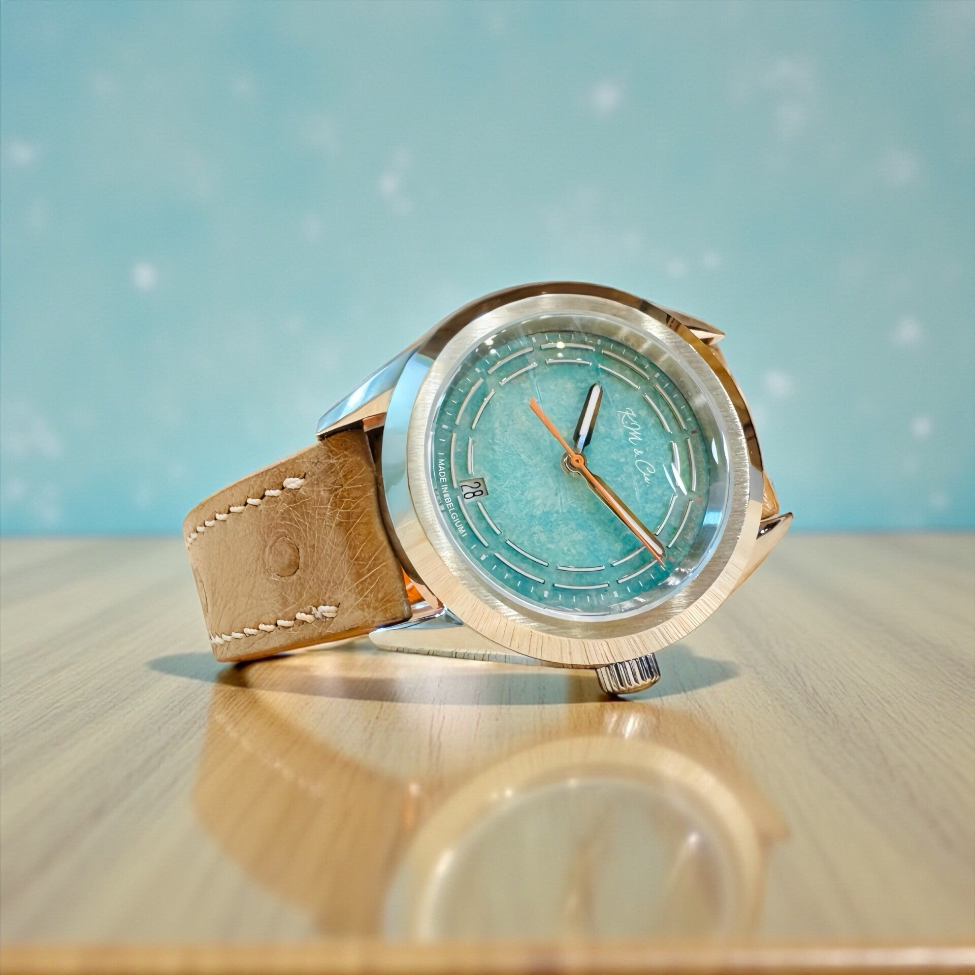 Venez découvrir la nouvelle version de la M.M01 en vous plongeant dans un cadran en pierre Amazonite qui vous fera penser à l'eau turquoise d'un lagon .