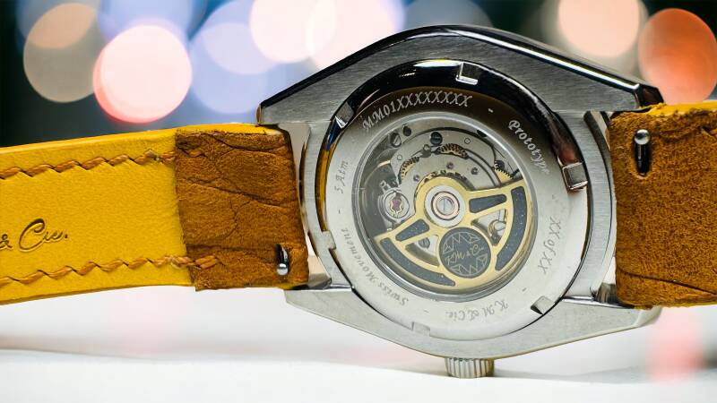 Elle est équipée du mouvement mécanique à remontage automatique Suisse STP1-21 et son tout nouveau rotor incrusté d'Aventurine visible à travers son fond transparent